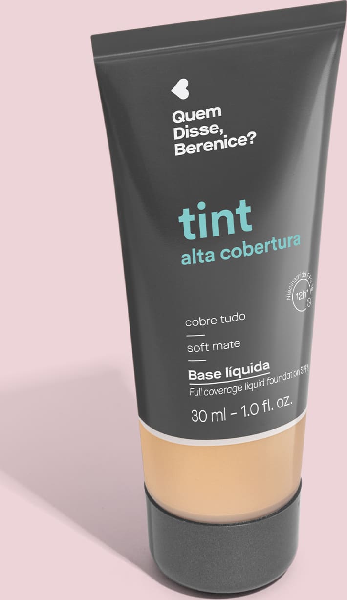 A Base Tint Alta Cobertura é aquela que cobre tudo, sabe? Com textura fluida, proporciona alta cobertura com apenas uma fina camada, não craquela e permite construção de camadas com acabamento soft mate, que não resseca sua pele.