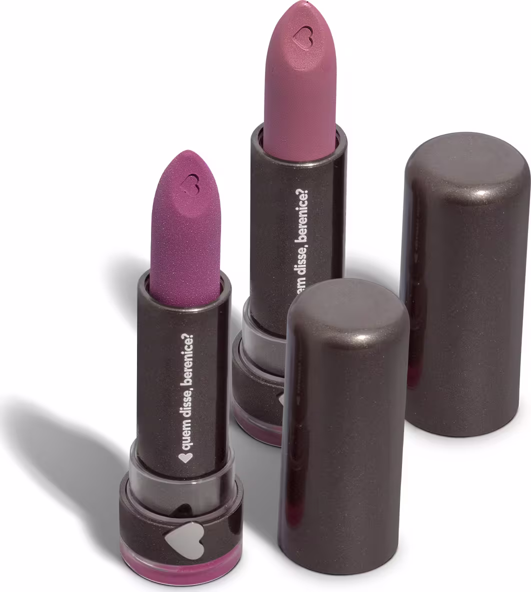 O Batom Mate Alta Pigmentação Quem Disse, Berenice? traz intensidade ao look com lábios coloridos, marcantes e saudáveis. Sequinho, mas confortável, proporciona uma cobertura alta, que dispensa retoques. Mesmo com acabamento mate, proporciona hidratação para os lábios, além de possuir FPS12. Confira as duas cores de longa duração que vem nesse combo: