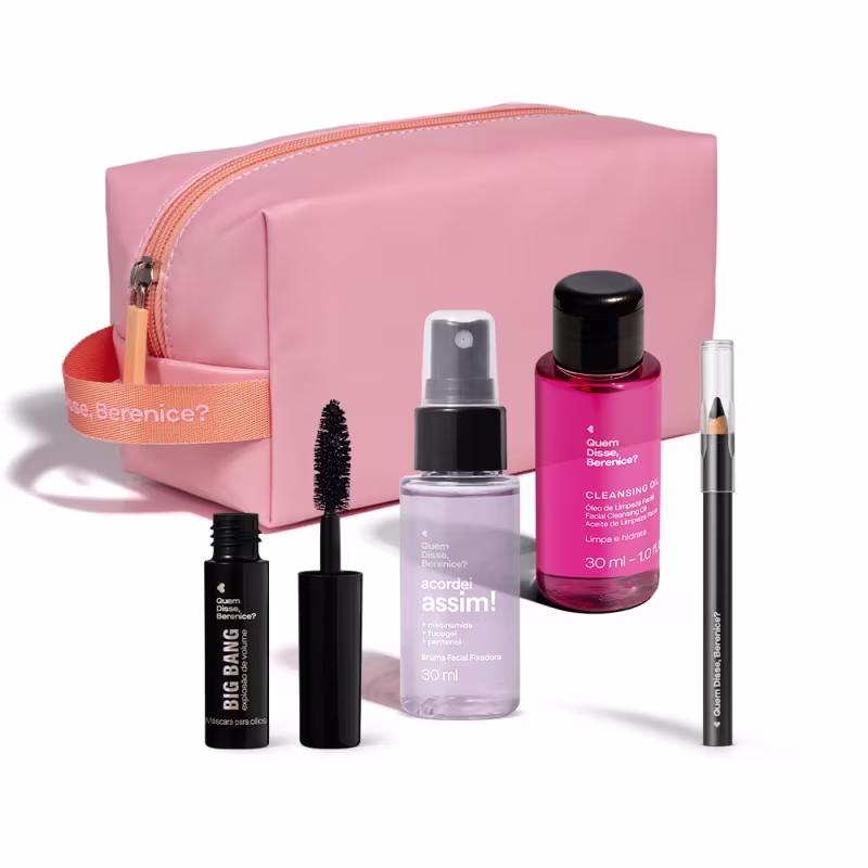 O Combo Mini Make traz mini itens indispensáveis para qualquer formato viagem. Com lápis de olhos,bruma facial fixadora, óleo de limpeza, máscara de cílios e um nécessaire rosa, este combo traz os itens básicos para começar qualquer produção: