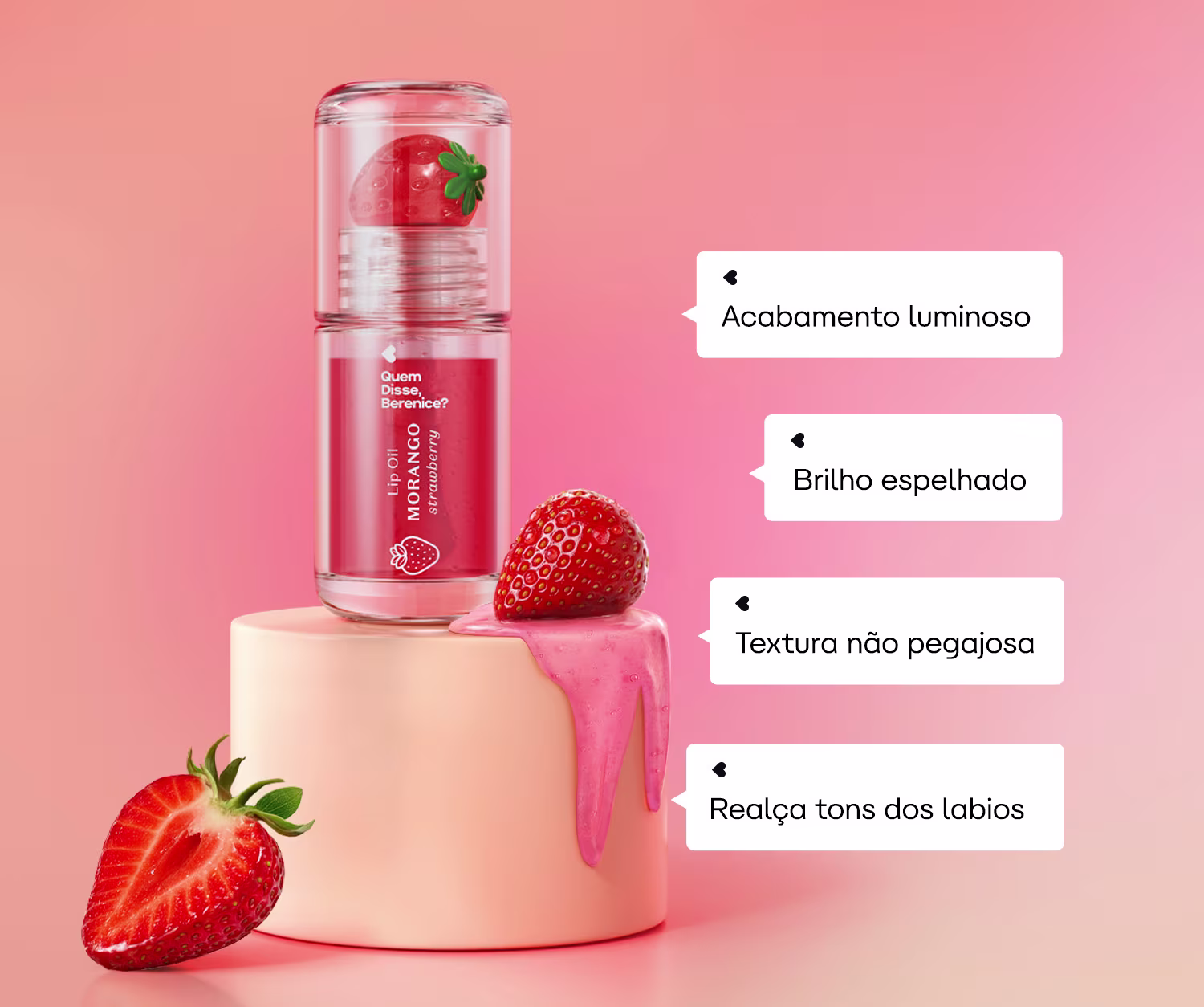 Brilho labial fofíssimo com cheirinho de morango, cor vermelha vibrante e um efeito espelhado e translúcido. Ver mais ❯